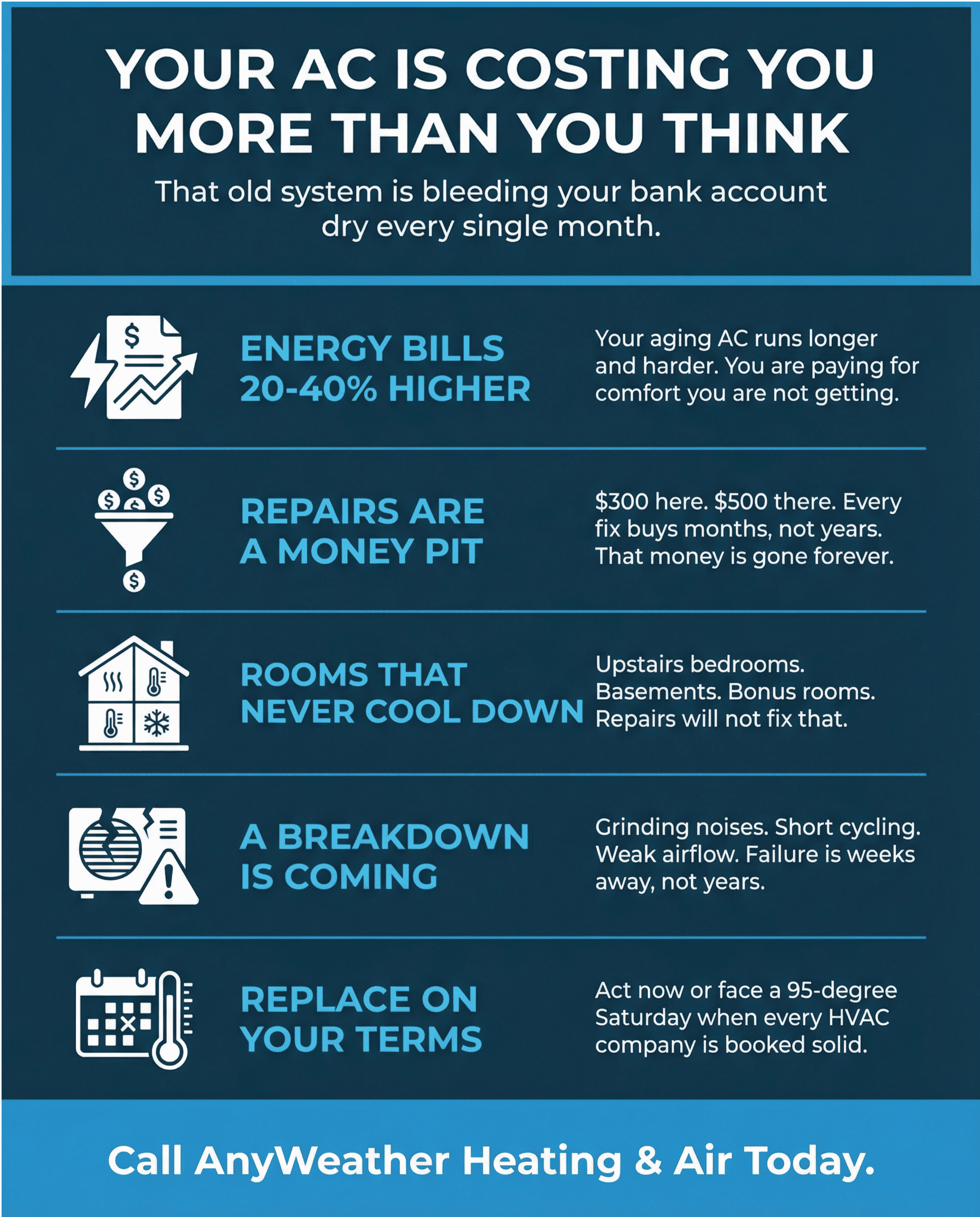 - Your energy bills are 20% to 40% higher than they should be. An aging AC runs longer and harder to cool the same space. You are paying for comfort you are not getting.
